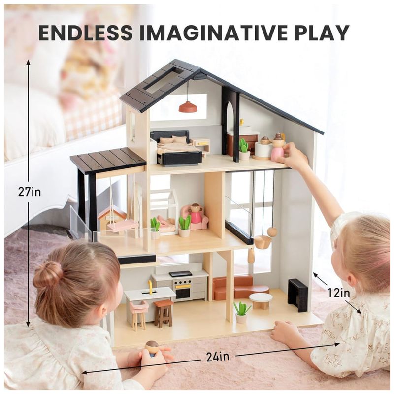 A casa de bonecas é fabricada com madeira ecológica de alta qualidade, representando durabilidade e resistência. Medindo 27H x 60,96 cm x 30,48 cm, oferece amplo espaço para várias crianças brincarem sem se sentirem lotadas. Na Tiny Land, estamos dedicados a oferecer serviços e produtos de primeira linha.