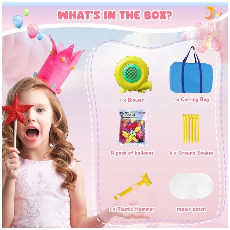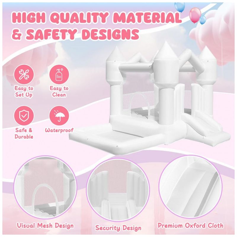DIVIRTA-SE NA CASA BRANCA! Nossa casa inflável oferece uma área de pulo, escorregador e até uma piscina de bolinhas ao lado. Além disso, incluímos 100 balões para decoração ou diversão das crianças. Aproveite mais tempo de qualidade com seus filhos de forma segura. Feita de tecido Oxford resistente e à prova d'água, com área de pulo cercada por parede de tela para maior segurança. Infla rapidamente com o soprador incluso. Versátil para uso em ambientes internos e externos, sendo perfeita para festas de aniversário, casamentos e reuniões familiares.