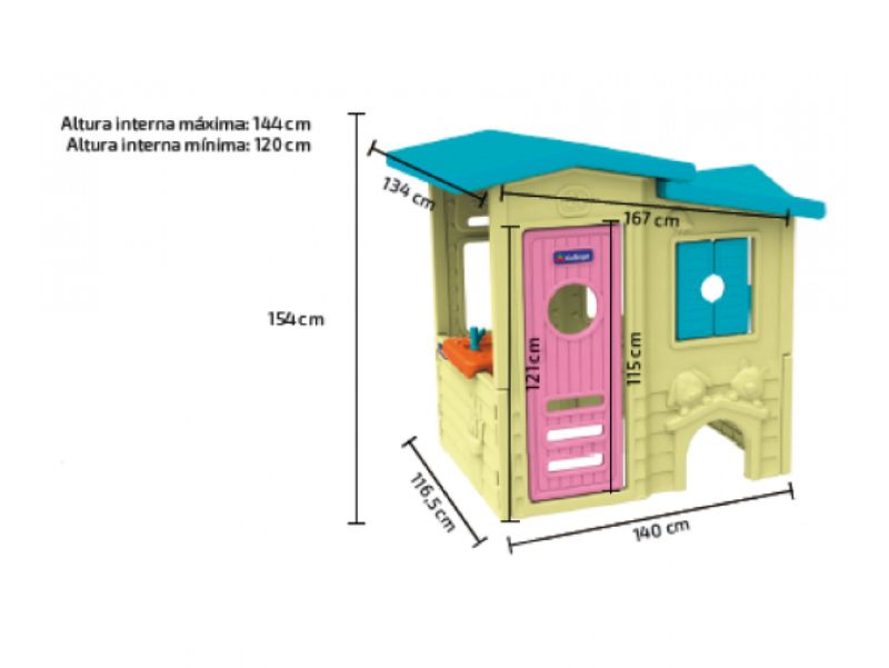 Chegou a Casinha Infanti House para completar a brincadeira da criançada!Com cores vivas e detalhes super divertidos, é fabricada com material resistente com proteção UV.Possui pia com fogãozinho e uma entrada para os pets das crianças.Além disso, conta ainda com uma lateral aberta para melhor visão dos pais ou responsáveis durante a brincadeira.Recomendado para crianças acima de 5 anos.É diversão garantida para o pequenos!ALTURA INTERNA: para crianças de até 1,50 mIdade 5 - 7 anosInmetro CE-BRI/IQB 005923Dimensões Aproximadas (AxLxC) 1,55 x 1,68 x 1,34mIdade Recomendada A partir de 5 anosItens inclusos Pia e Fogãozinho.Peso do produto 50,39 Kg