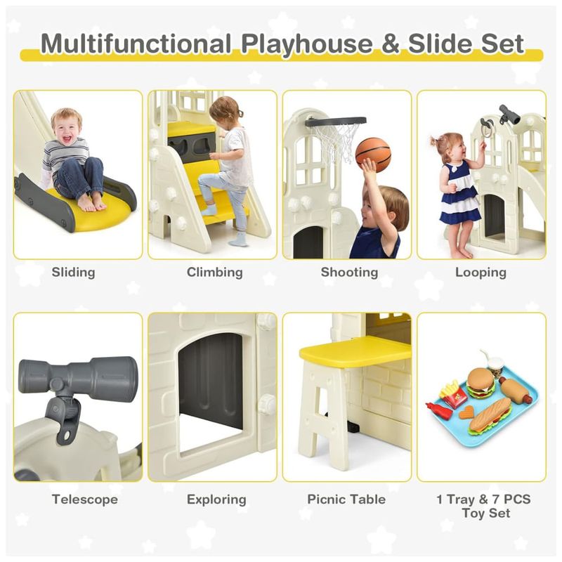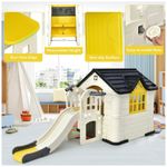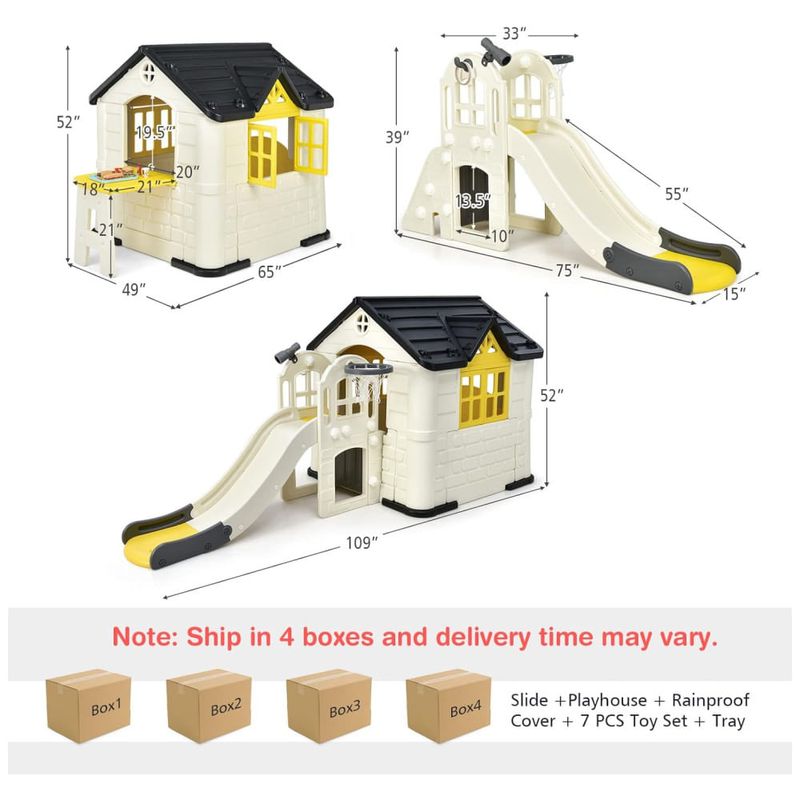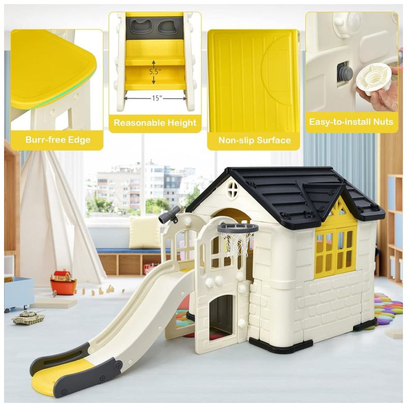 Casinha Infantil para Área Externa 7 em 1 com Cesta de Basquete, Escorregador e Capa à Prova D'água, Costzon, Branca e Amarela