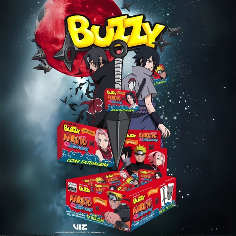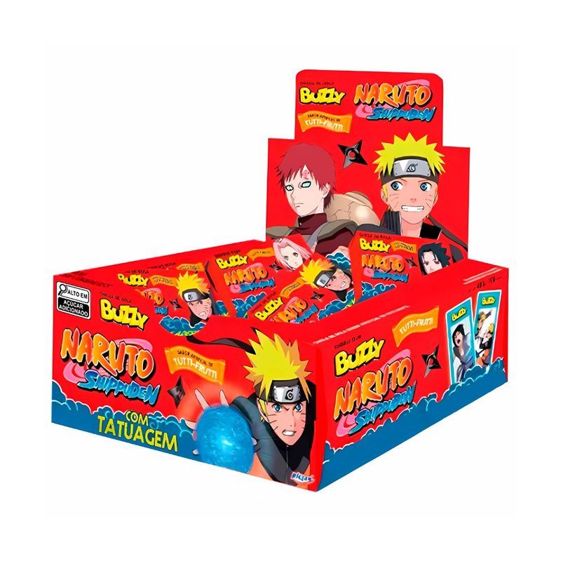 O ninja mais famoso dos animes chega com a sua nova coleção de Chicle Buzzy Naruto Shippuden nos deliciosos e favoritos sabores tutti-frutti e hortelã. Com tatuagens incríveis, a coleção ainda conta com um porta tatuagem incrível para colecionar. A caixa contém 90 unidades no sabor tutti-frutti.