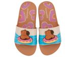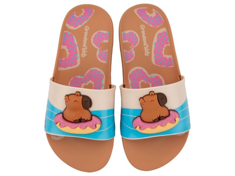 Para a versão da gáspea, onde nossa capivara está em uma destaque em uma boia de donuts, deixando ainda mais lúdico o arquétipo, uma serigrafia de ondas complementa a cena, para o palmilha, boias de coração preenchem a sola. As capivaras são sucesso entre as crianças de todas as idades. Capivara em destaque em cenários super lúdicos. Chinelo fácil de calçar e clássico entre os pais e as crianças.