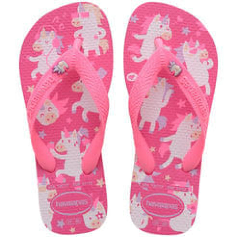 O chinelo Havaianas Kids Fantasy Unicórnio é confeccionado em material emborrachado, com cabedal na cor rosa que contém aplicação em relevo com o nome da marca e um pin super fofo de unicórnio, com solado antiderrapante e entressola com absorção de impacto. O formato do calçado proporciona o calce perfeito. A estampa com tema unicorn é sucesso!