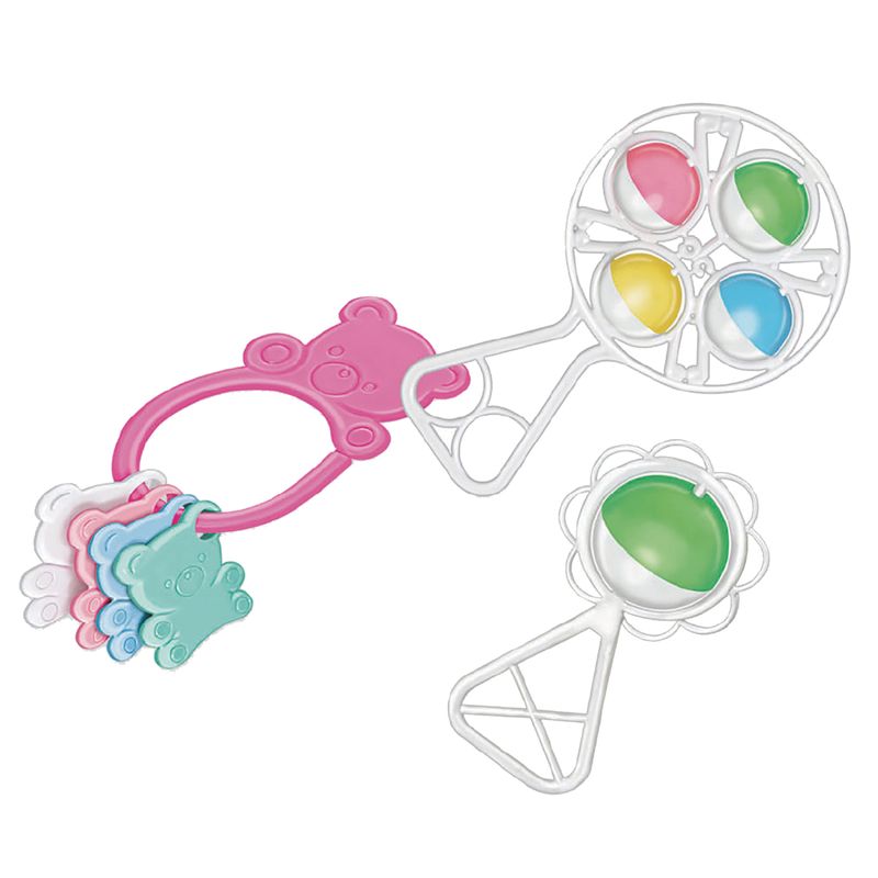 Kit com 3 peças, mordedor no formato de urso, chocalho com 1 bola e chocalho com 4 bolas.