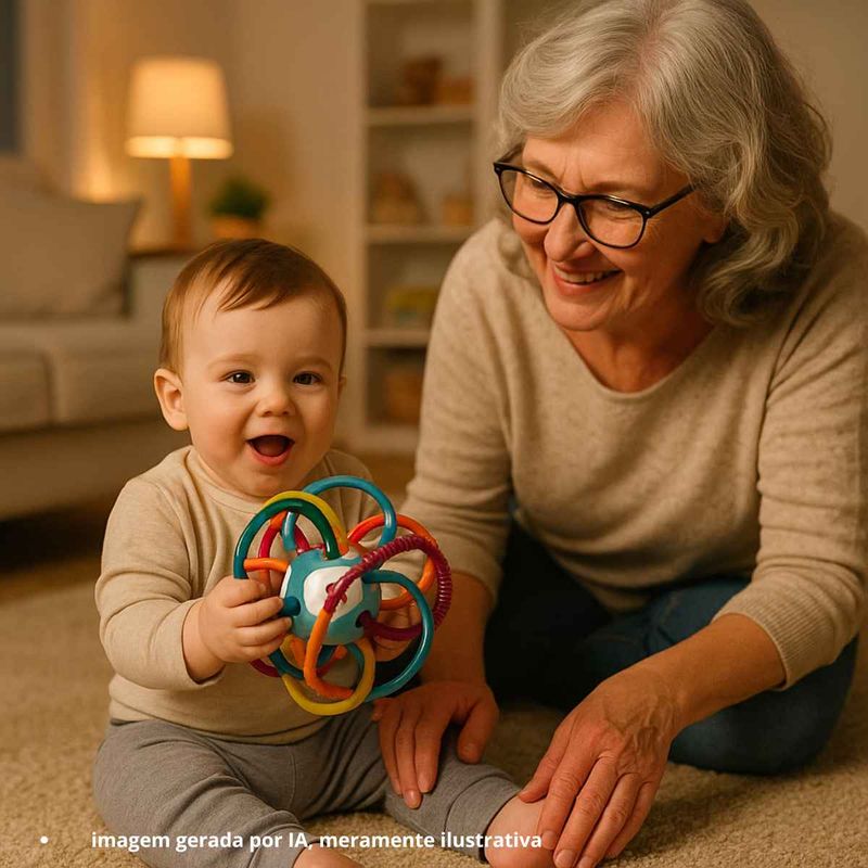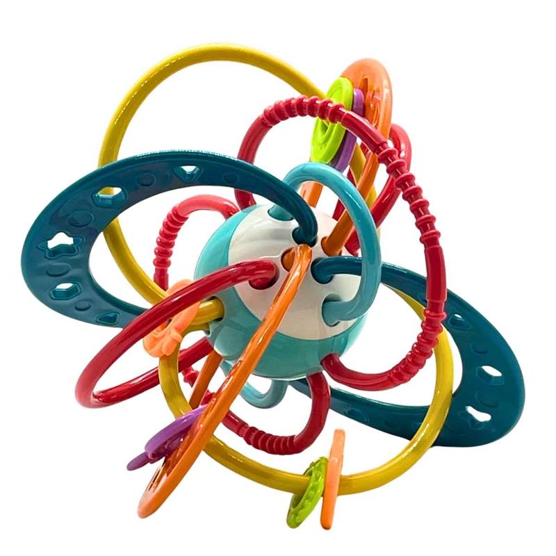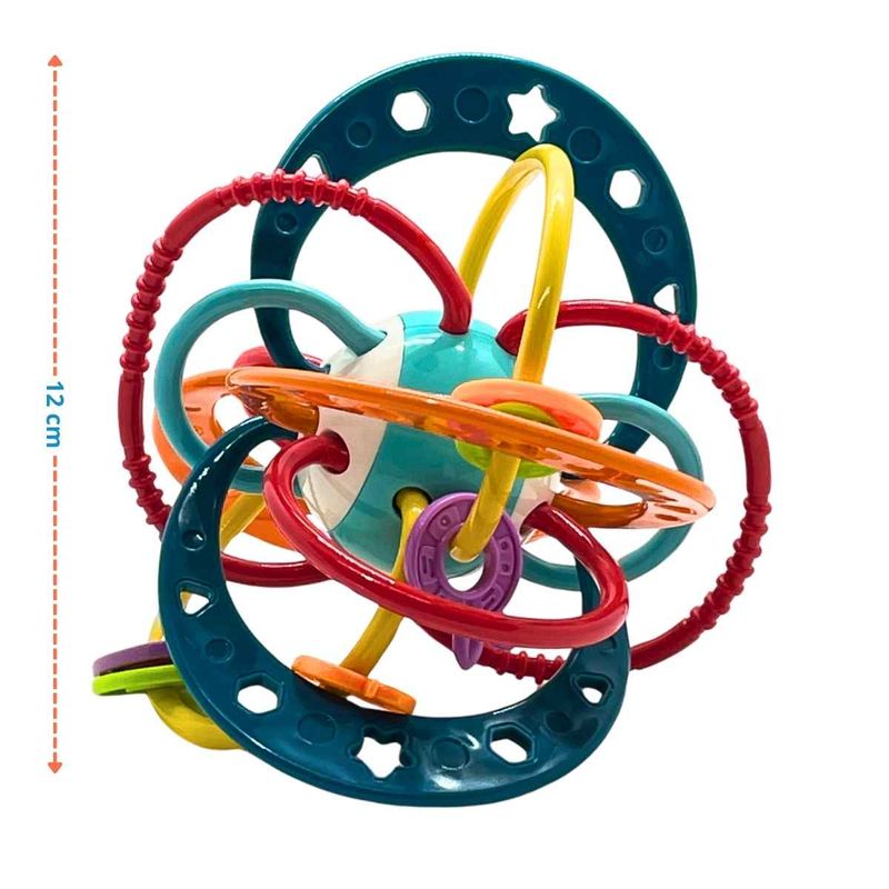 Além de ser um mordedor seguro, o brinquedo também funciona como chocalho, emitindo sons suaves que despertam a atenção e promovem o estímulo auditivo. Suas cores vibrantes e formas atrativas incentivam o estímulo visual, enquanto a textura agradável e o formato fácil de segurar favorecem o estímulo tátil e a coordenação motora.