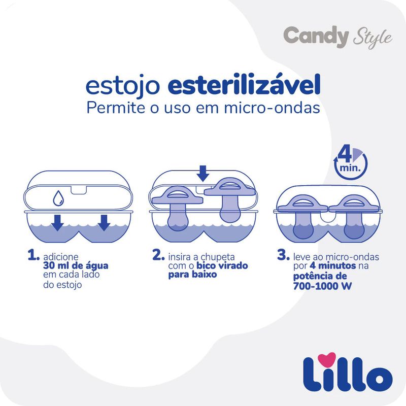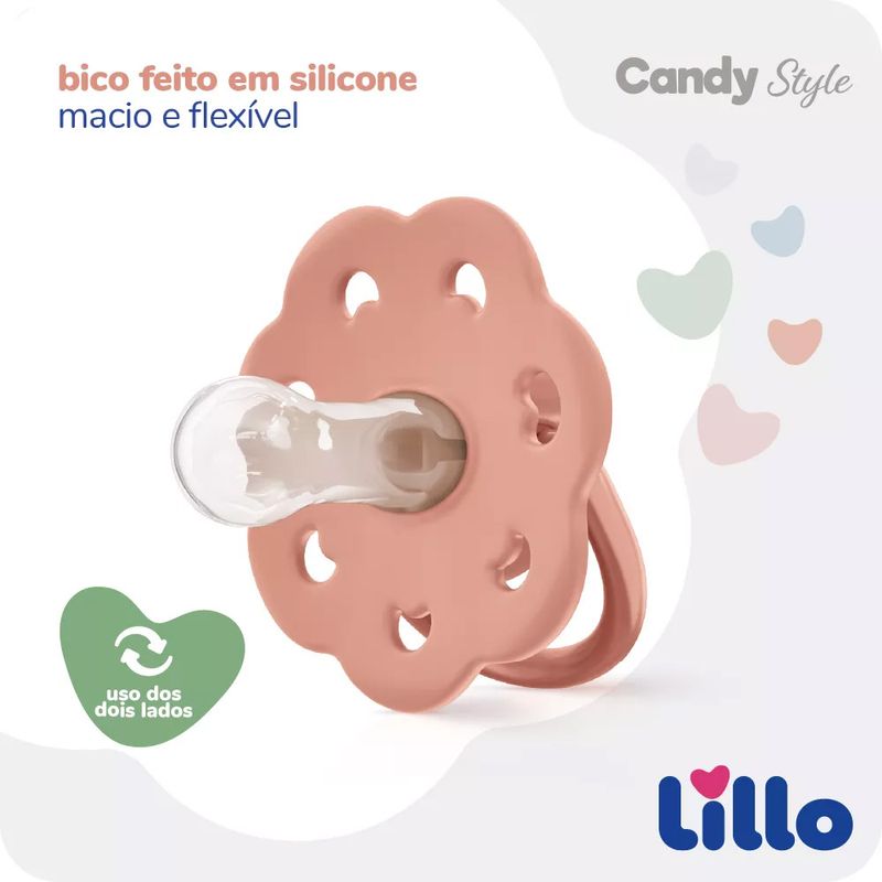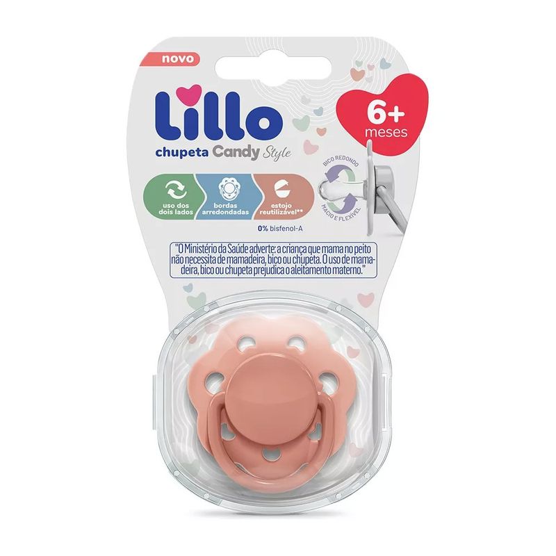 A chupeta Candy Style da Lillo foi desenhada com um escudo arredondado para melhor acomodação e conta com grandes canais de ventilação que facilitam a circulação de ar durante o uso, reduzindo o contato com a pele.