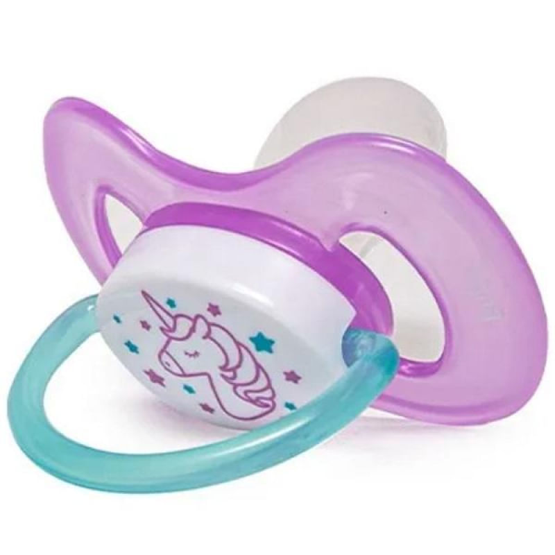 Bico simétrico em silicone ultra soft, a chupeta é confortável e resistente.