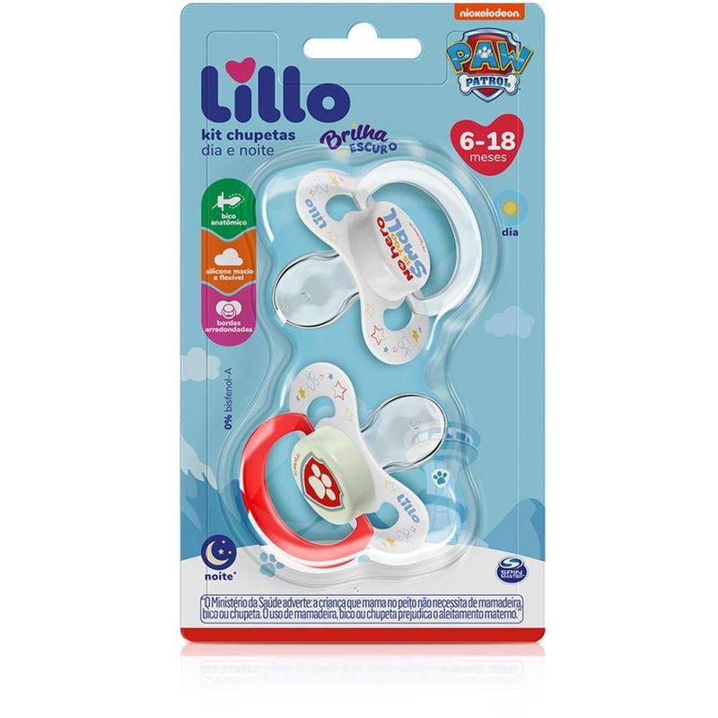 O Kit com 2 Chupetas Funny Dia e Noite da Patrulha Canina Lillo apresenta uma decoracao exclusiva com a personagem mais querida dos bebes. O formato de seu escudo com bordas arredondadas permite uma melhor acomodacao ao rosto do bebe e possui canais de ventilacao maiores que facilitam a circulacao de ar, e nao irritam a pele sensivel da crianca. Possui bico com formato anatomico em silicone macio e flexivel. A versao noite da chupeta possui botao com tecnologia que brilha no escuro, podendo ser encontrada facilmente sem precisar acender a luz. Livre de Bisfenol-A. A chupeta e recomendada para bebes maiores de 6 meses.