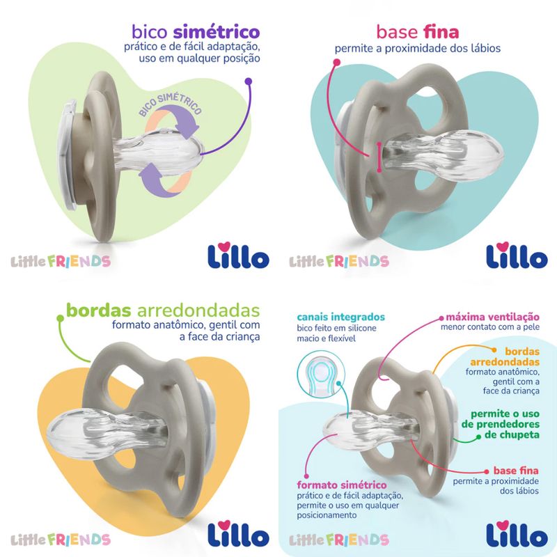 A Chupetas Little Friends Lillo possui bico em silicone macio e flexível, foi desenvolvido em formato simétrico que possibilita o uso em qualquer posição, sua base fina permite que o bico fique mais próximo aos lábios da criança, proporcionando maior conforto e fácil adaptação.