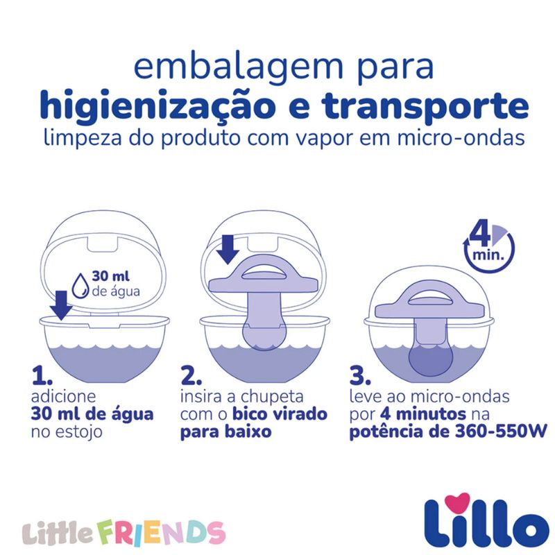 A chupeta possui um estojo protetor para higienização.