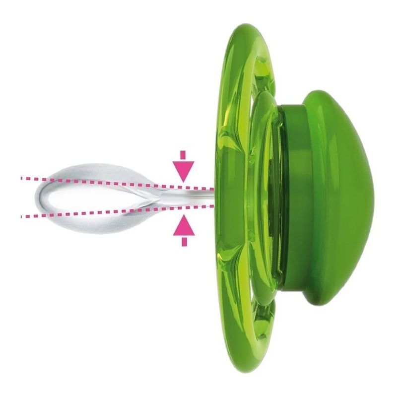 Desenvolvida por especialistas da saúde, a chupeta é 4 vezes mais flexível que outras chupetas convencionais, o que permite o fechamento natural da boca. Acompanha um estojo esterilizável, que esteriliza a chupeta no microondas em 3 minutos e permite seu armazenamento e transporte.