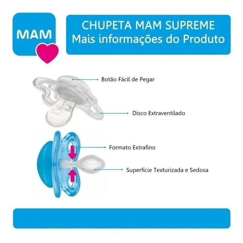 A Chupeta MAM Supreme foi especialmente desenvolvida para reduzir o risco de desalinhamento dos dentes. Seu bico extrafino em Silicone SkinSoft é macio, com superfície texturizada e sedosa. Além disso, a Chupeta é superleve e confortável por conta do exclusivo disco ventilado, que foi especialmente desenhado para permitir a circulação do ar, e dos furos de ventilação, para não irritar a pele sensível do bebê.