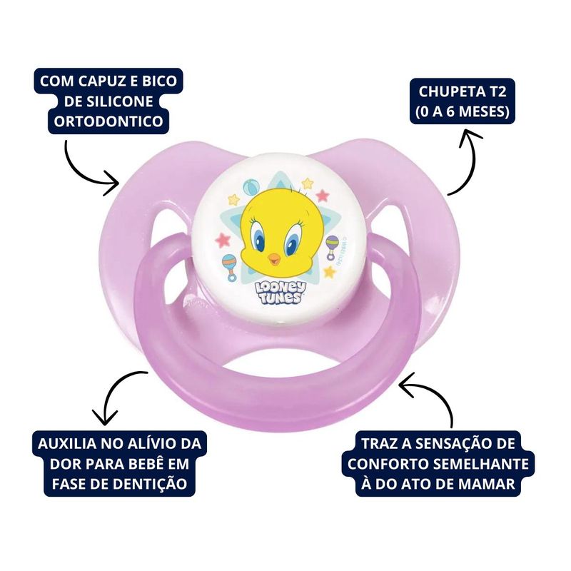 Chupeta T2 Looney Tunes Piupiu Com Capuz e Bico de Silicone Ortodôntico +6 Meses 1 unidade BabyGo
