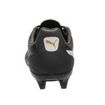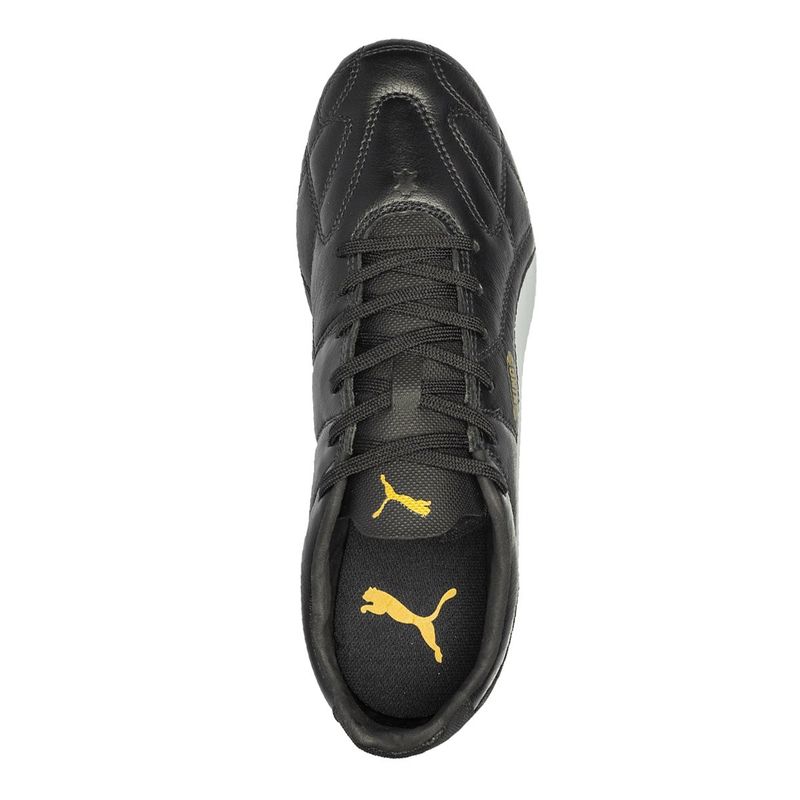 Passe a ser o rei dos gramados com a Chuteira Campo Puma King FG BDP. Seu cabedal de qualidade produzido em couro é durável e confortável. O produto possui fechamento por cadarço, auxiliando o ajuste aos pés. A palmilha removível é ideal para a higienização. Solado em TPU com travas posicionadas estrategicamente para mais tração e força nos gramados. Design elegante em uma vibe clássica na cor predominante preta e a icônica faixa Formstrip em branco. Detalhes da marca em dourado. Referência: 106455.