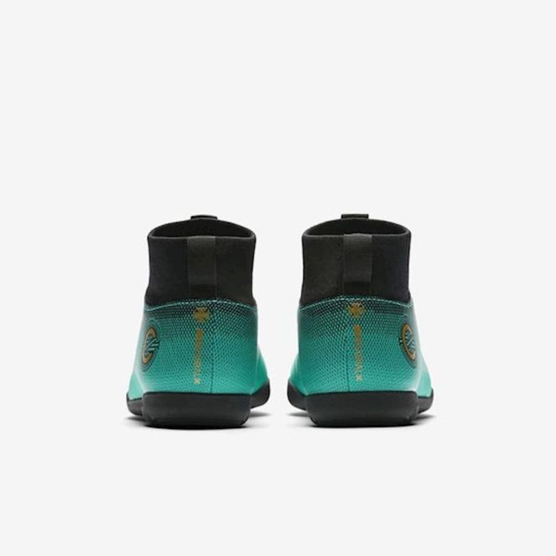 Chuteira Nike CR7 Jr. Superfly 6 Club IC (31 ao 36) <br>Marca: Nike. <br>Ref: AJ3087-390 (2Q18) <br>Cor: JADE/GOLD BLACK <br>Tamanho: 31, 32, 33, 34, 35 e 36. <br> <br>A Chuteira Infantil Nike Jr. MercurialX Superfly VI Academy para Quadras/Superfícies Internas proporciona excelente toque de bola e um ajuste confortável e seguro que promove a aceleração e permite rápida mudança de direção em quadra. <br> <br> <br>BENEFÍCIOS <br> <br>O punho Dynamic Fit cria um ajuste moderno, como o de uma meia. <br>Construção sintética para suporte confortável. <br>Palmilha para amortecimento leve e com ótima resposta. <br>Solado para superfícies internas/quadras (IC) para tração nas ruas, quadras e superfícies internas. <br>Solado que não deixa marcas.