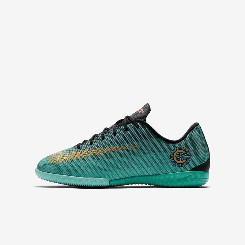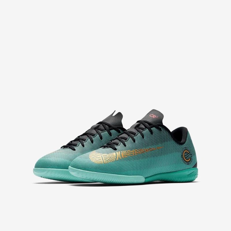 Chuteira Nike VaporX 12 Academy (IC) (31 ao 36) <br>Marca: Nike. <br>Ref: AJ3099-390 (2Q18) <br>Cor: JADE/GOLD/BLACK <br>Tamanho: 31, 32, 33, 34, 35 e 36. <br> <br> <br> <br>A Chuteira Infantil Nike Jr. MercurialX Vapor XII Academy CR7 Indoor/Court envolve o seu pé para um conforto durável e excelente controle de bola. O solado que não deixa marcas proporciona tração agressiva em diferentes superfícies indoor. <br> <br> <br>BENEFÍCIOS <br> <br>Construção sintética proporciona suporte confortável. <br>Palmilha para amortecimento leve. <br>Solado para superfícies internas/quadras (IC) para tração nas ruas, quadras e superfícies internas. <br>Solado que não deixa marcas. <br> <br>CR7 <br> <br> <br>Cristiano Ronaldo dominou os maiores estádios do mundo desde que iniciou sua carreira profissional no futebol. Com diversos prêmios de Jogador do Ano, ele passou de prodígio ao maior de todos os tempos em apenas uma década. Sua mentalidade de vencedor, velocidade explosiva e artilharia o tornaram um vencedor prolífico recordista em todos os níveis.