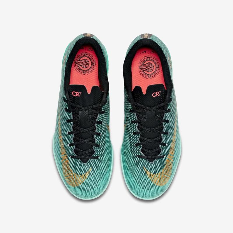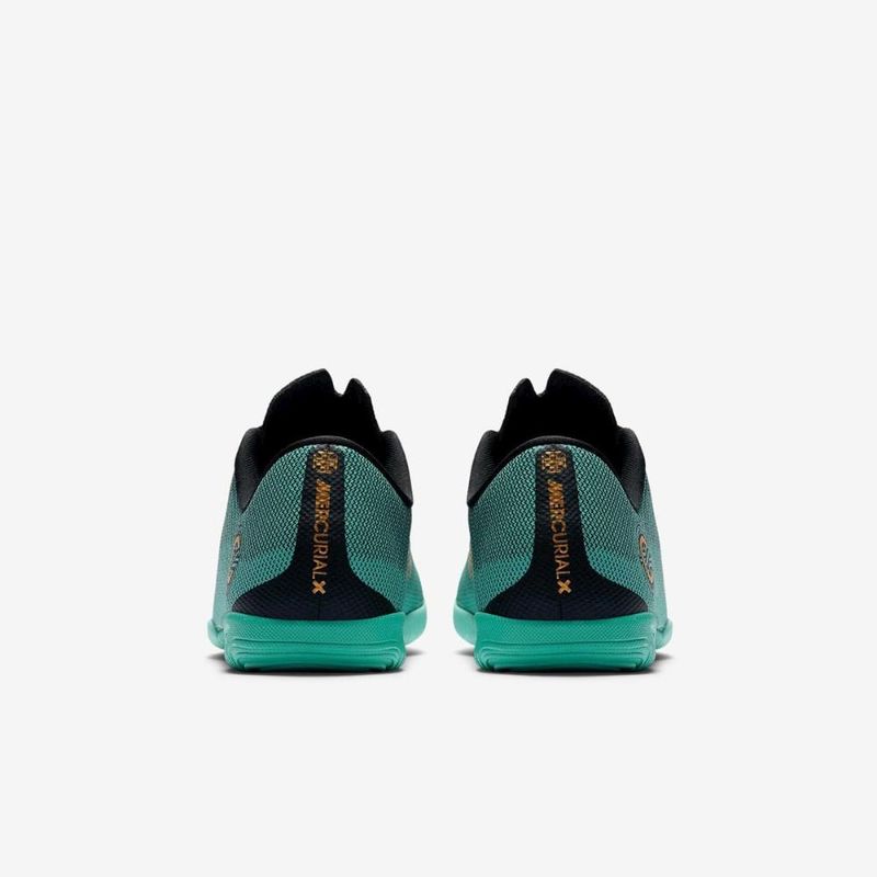 Chuteira Nike VaporX 12 Academy (IC) (31 ao 36) <br>Marca: Nike. <br>Ref: AJ3099-390 (2Q18) <br>Cor: JADE/GOLD/BLACK <br>Tamanho: 31, 32, 33, 34, 35 e 36. <br> <br> <br> <br>A Chuteira Infantil Nike Jr. MercurialX Vapor XII Academy CR7 Indoor/Court envolve o seu pé para um conforto durável e excelente controle de bola. O solado que não deixa marcas proporciona tração agressiva em diferentes superfícies indoor. <br> <br> <br>BENEFÍCIOS <br> <br>Construção sintética proporciona suporte confortável. <br>Palmilha para amortecimento leve. <br>Solado para superfícies internas/quadras (IC) para tração nas ruas, quadras e superfícies internas. <br>Solado que não deixa marcas. <br> <br>CR7 <br> <br> <br>Cristiano Ronaldo dominou os maiores estádios do mundo desde que iniciou sua carreira profissional no futebol. Com diversos prêmios de Jogador do Ano, ele passou de prodígio ao maior de todos os tempos em apenas uma década. Sua mentalidade de vencedor, velocidade explosiva e artilharia o tornaram um vencedor prolífico recordista em todos os níveis.