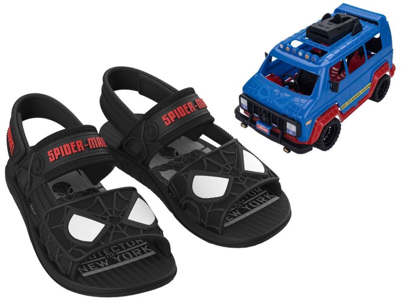 O design encontra a fantasia fantástica com o Furgão do Homem Aranha! São diversas brincadeiras interativas em um só veículo. Com a garra articulada localizada na parte traseira do furgão, a criança pode capturar outros bonecos e puxá-los para dentro da caçamba, brincando de ser o próprio Spider! No topo, possui um lançador de discos que pode ser escondido ou acionado pela criança, deixando o veículo mais divertido e surpreendente. Também possui banco, volante funcional e 4 rodas livres. A sandália do combo conta com fechamento em velcro, importante para o uso cotidiano e com sobreposições que agregam valor e novidade para o formato clássico gáspea e talão, misturando elementos manufaturados e contornos lisos. Foco para o personagem, cujo uniforme serve de referência para a elaboração de novas texturas, assim como detalhamentos orgânicos de teias que se destacam através de suas linhas e os olhos cativantes e tão icônicos que permeiam nosso imaginário desde sua aparição nos quadrinhos.