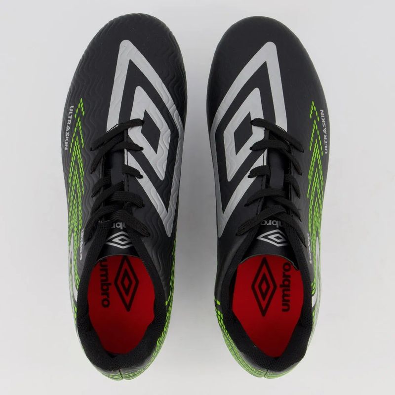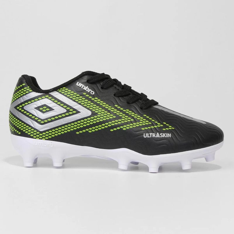 Criada pela Umbro, a chuteira modelo Ultraskin, é a proposta ideal para as partidas de campo com gramado natural. Seu cabedal é construído em material sintético texturizado, o solado conta com travas altas e fixa e traz design em preto com detalhes no verde.