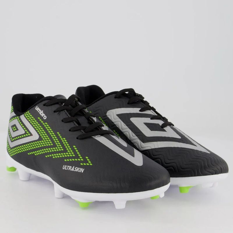 Criada pela Umbro, a chuteira modelo Ultraskin, é a proposta ideal para as partidas de campo com gramado natural. Seu cabedal é construído em material sintético texturizado, o solado conta com travas altas e fixa e traz design em preto com detalhes no verde.