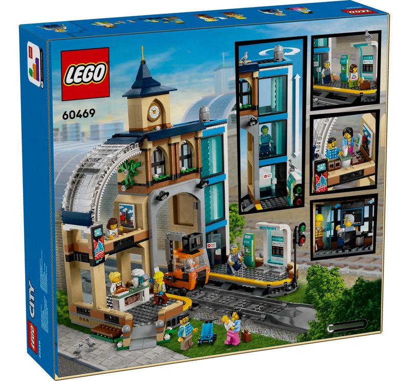 Coberta por uma torre de relógio clássica, a estação de brinquedo inclui uma cafeteria aconchegante, um elevador funcional, uma sala de controle, um ponto de ônibus, 2 plataformas para passageiros, um display de horários e uma máquina de bilhetes. As crianças também ganham um vagão de manutenção equipado com plataforma elevatória, além de 6 minifiguras, um boneco de bebê e 2 bonecos de pombo para brincadeiras de faz de conta e contação de histórias.