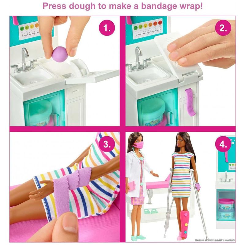 A boneca médica Barbie também pode usar massa na estação de fabricação de ataduras para criar um envoltório para os ferimentos de seus pacientes também