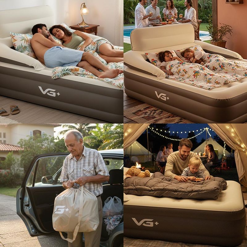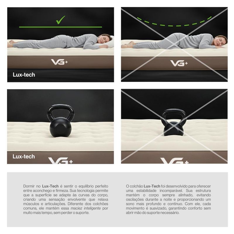 Esqueça o desconforto de colchões infláveis comuns que perdem o ar ou dependem de tomadas próximas. A linha Lux-Tech da VG PLUS foi desenvolvida para solucionar os problemas mais frequentes em acampamentos, viagens e recepção de hóspedes, unindo estabilidade premium com tecnologia sem fio. O grande diferencial deste modelo é a autonomia. Equipado com uma bomba de 4000mAh recarregável via USB-C, o colchão dispensa o uso de cabos ou extensões durante o enchimento. Em apenas 4 minutos, a estrutura está totalmente inflada e pronta para uso. Além disso, a bomba é removível, funcionando como um acessório versátil para inflar outros itens ou iluminar o ambiente com sua lanterna integrada de 3 níveis.