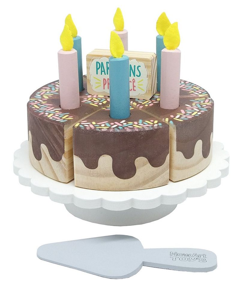 Conteúdo: 01 bolo fatiado com 06 peças com velcro, 01 faca de corte e 01 prato (17 cm x 17 cm x 5 cm).