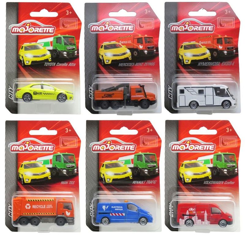 Coleção c/ 6 Miniaturas da CidadeMarca do produto: MajoretteColeção: City - Cidade.Escala: 1/64 (de 7,5 a 8 cm de comprimento)Miniatura em Metal Fundido (Die-Cast) com partes de plástico.Carros com roda livre.Alguns Veículos possuem partes móveis (abrem a porta ou tampa da caçamba)Miniaturas desta coleção:1 - Toyota Corolla Altis (Taxi)2 - Mercedes-Ben Zetros (Caminhão de Serviços c/ Garra)3 - Hymermobil Exsis-I4 - Man TGS (Caminhão de Lixo Reciclável)5 - Renault Trafic (Manutenção Elétrica)6 - Volkswagen Crafter (City Tour)
