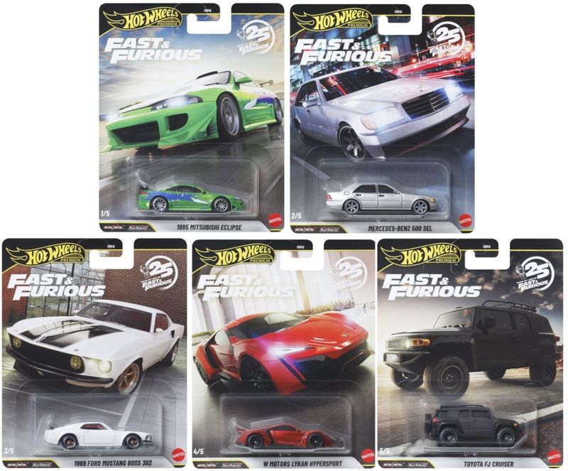 Coleção Completa com 5 Miniaturas Fast & Furious Marca do produto: Hot Wheels - Mattel. Coleção: Fast & Furious (Velozes e Furiosos). Escala: 1/64 Metal/Metal: Chassi e carroceria feitos de metal Real Riders: Pneus de borracha Miniaturas desta coleção: #1 ’95 Mitsubishi Eclipse #2 Lancer Evolution IX #3 ’69 Ford Mustang Boss 302 #4 W Motors Lykan Hypersport #5 Toyota FJ Cruiser