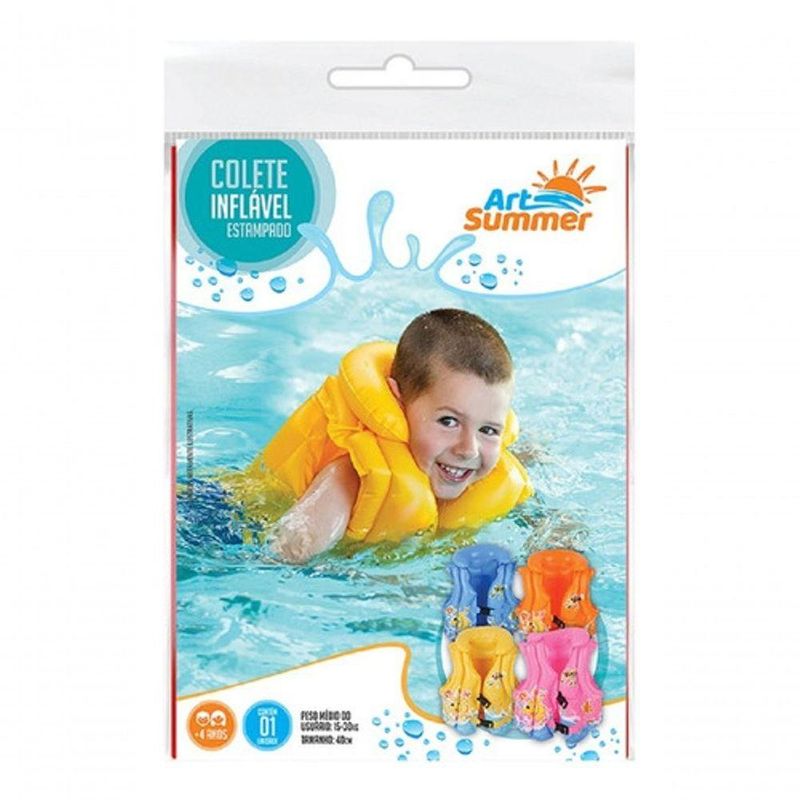 Colete Boia Inflável Estampado - Art SummerInformações do Produto: O Colete possui duas fivelas para ajuste que garantem maior segurança das crianças. Sua cor facilita na hora dos pais visualizarem seus filhos durante a brincadeira na água. Perfeito para os seus passeios de fim de semana na praia, piscina e no clube. Peso médio suportado 15 a 30kg.Itens inclusos: 1 colete boia inflável.Dimensões aproximadas do produto: 40cm de altura.Recomendado: Não recomendado para crianças menores de 03 anos.Alimentação: Não Necessita.Material composição: Pvc.Certificação: item 15 do Anexo V da Portaria Inmetro nº 302/2021.Garantia do Fabricante: 03 meses contra defeitos de fabricação.Aviso: Todas as informações divulgadas são de responsabilidade exclusiva do fabricante/fornecedor. As cores dos tecidos ou dos produtos podem variar entre as imagens mostradas acima ou fotos da embalagem. Imagens meramente ilustrativas.