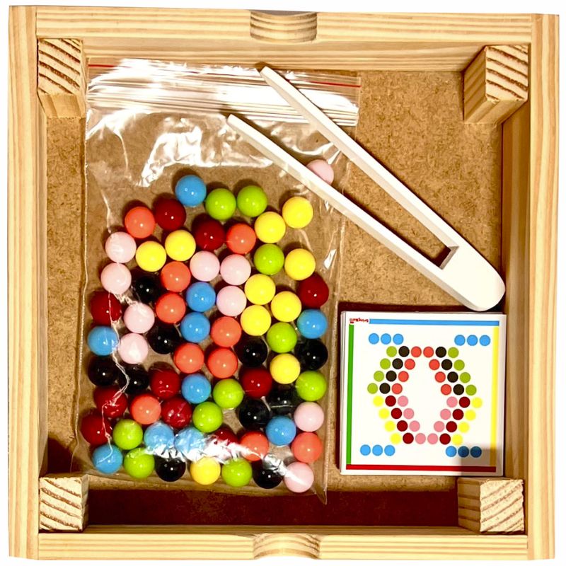 Quantidade de peças: 70 Esferas, 01 Pinças, 16 Fichas.