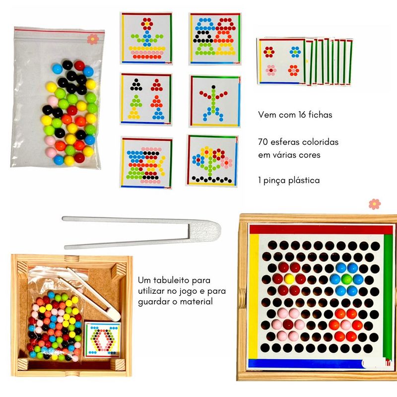 Ele vem com várias esferas coloridas, pinça e fichas. Estimule a criança a reproduzir os desenhos das fichas que acompanha o jogo, segundo as cores, estimula a coordenação motora fina, atenção, imaginação.