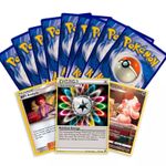 O lote contém 100 cartas Pokémon, incluindo uma seleção de Comuns, Incomuns, Energia e Treinadores, com 5 cartas brilhantes (holo ou reverse foil).