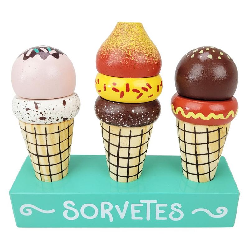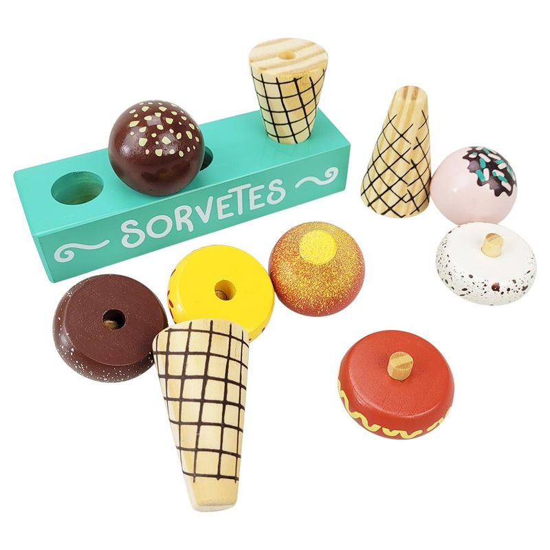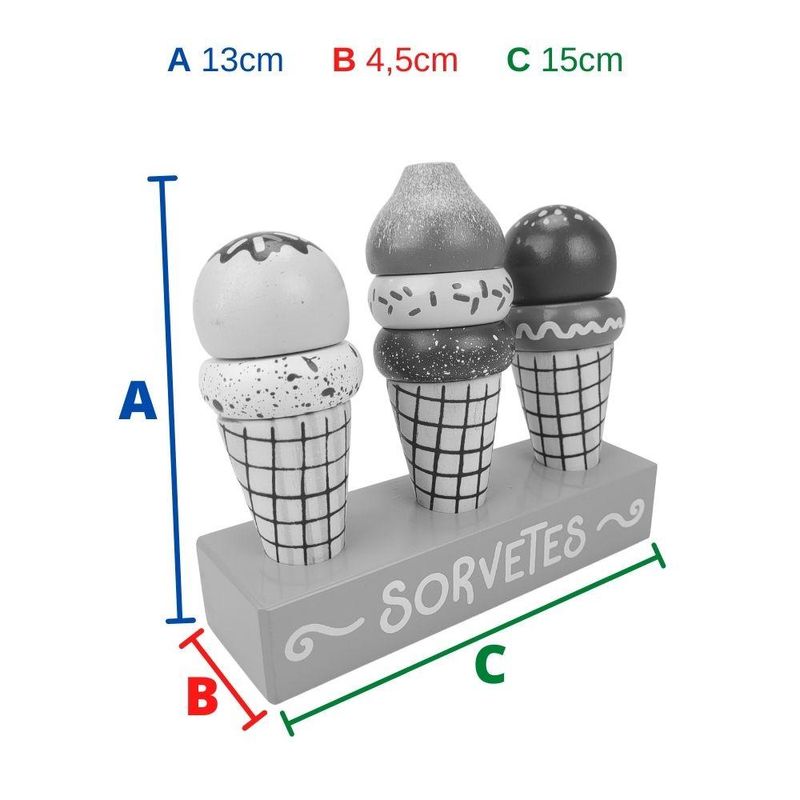 Conteúdo da Embalagem: 3 Sorvetes de Brinquedo e 1 Base de Madeira.