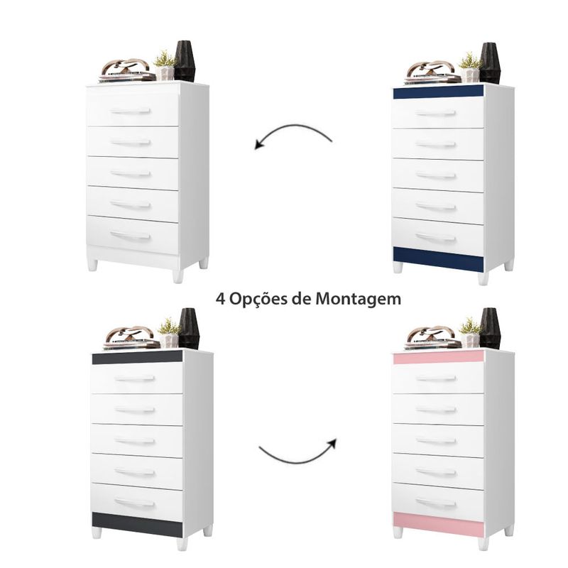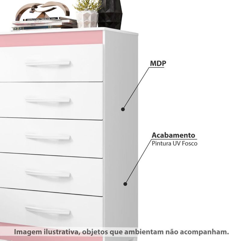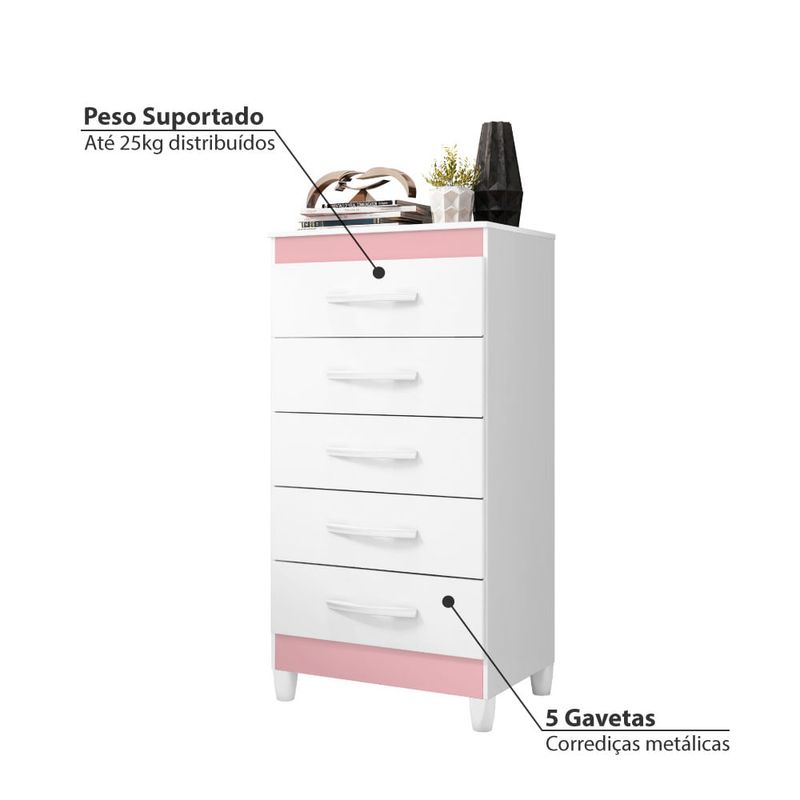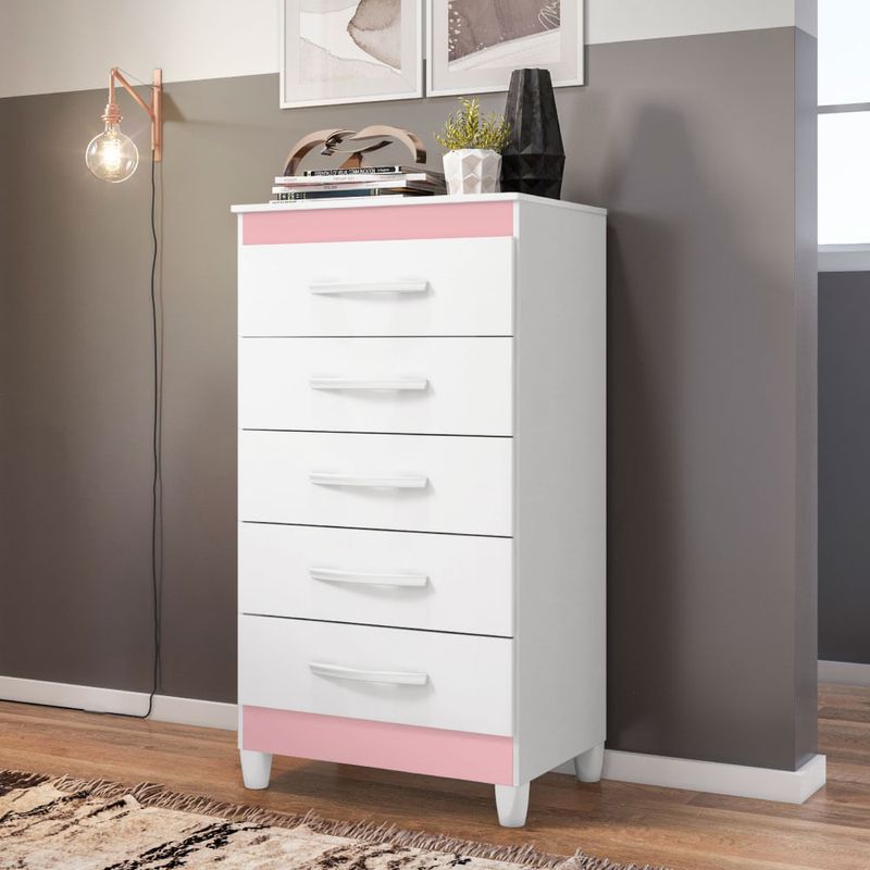 Cômoda Alta Esmeralda com 5 Gavetas Flex - Branco/Rosa