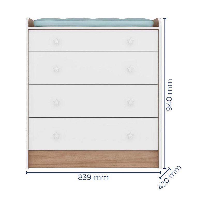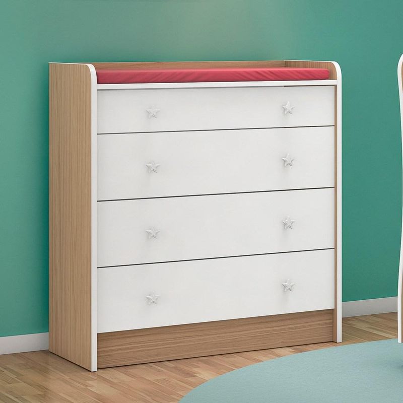 Cômoda Infantil Trocador Doce Sonho 4 Gavetas Carvalho Rústico Toq/Branco, estrutura reforçada confeccionada em MDP de qualidade com acabamento em pintura UV que proporciona maior durabilidade e resistência ao produto, design exclusivo para deixar o quarto do seu bebê mais bonito. Possui 4 gavetas com excelente profundidade, puxadores exclusivos em formato de estrela e espaço para trocador facilitando na hora de trocar o bebê. Confira e garanta já a sua!