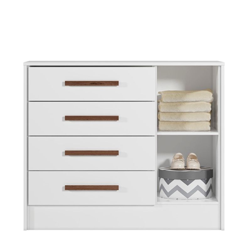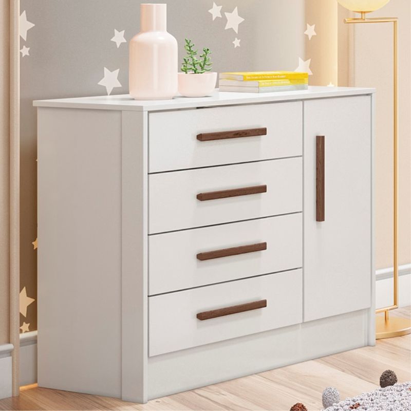 Ela possui 4 gavetas e 1 prateleira, garantindo uma boa organização;