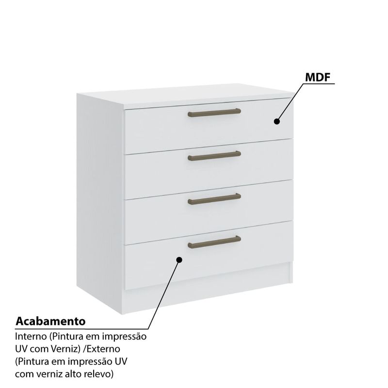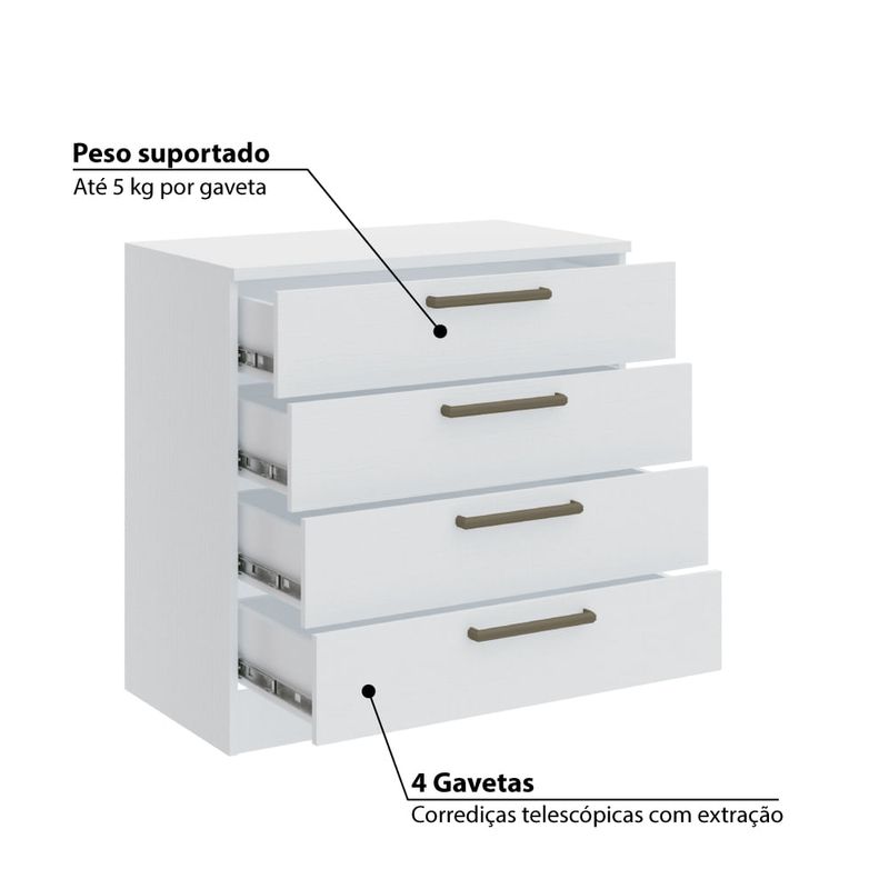 A Cômoda Modulada Requinte é versátil, pois possibilita você acrescentar opções de módulos conforme seu desejo e necessidade. Ele é perfeito para colocar no quarto, fazendo com que você aproveite todos os espaços. Conta com 4 gavetas com muito espaço para guardar objetos. E, se você desejar ampliar esse móvel, bastar comprar e associar outros módulos Requinte ao roupeiro, mas antes, verifique a medida e o desenho do seu espaço para certificação dessa incrível possibilidade.