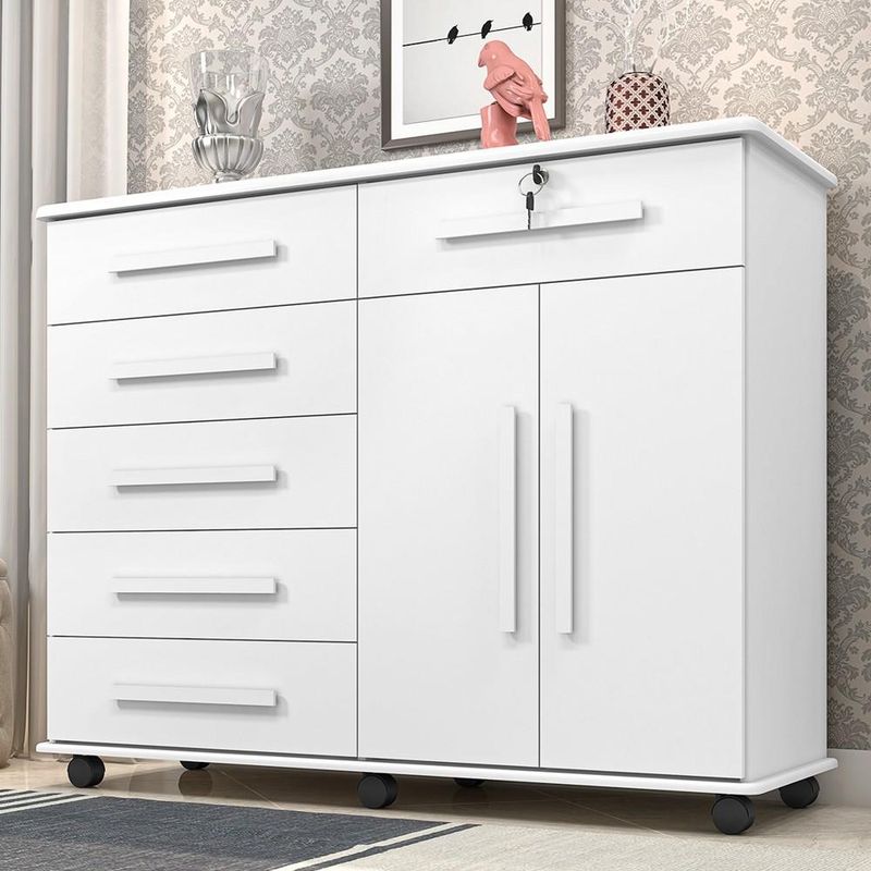 A Cômoda Gran Luxo da Mpozenato como o próprio nome sugere, remete a requinte e funcionalidade. Ela é fabricada em madeira de qualidade e conta com rodízios que facilitam a locomoção do móvel pelo cômodo sem danificar o chão ou a própria cômoda. Além disso, possui 2 portas e 6 gavetas, trazendo o espaço e repartições necessárias para organizar suas roupas, sapatos e objetos diversos conforme sua necessidade. Ah, e uma das gavetas dessa cômoda para quarto possui chave, incrível né?