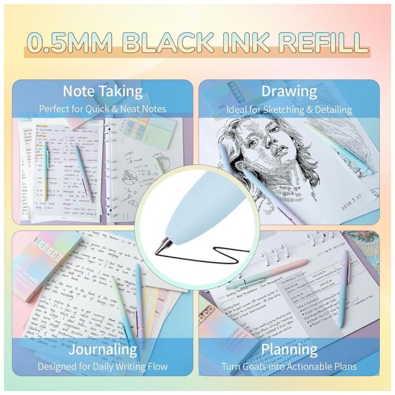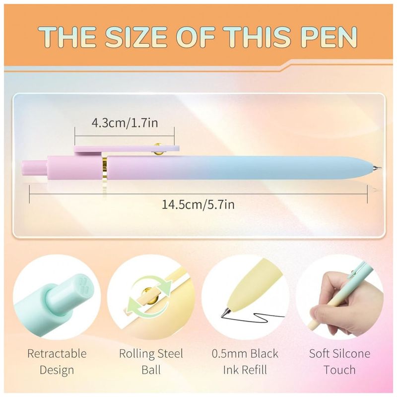 O corpo em plástico ABS com toque macio oferece empunhadura confortável, adequado para períodos prolongados de escrita em aulas, reuniões ou planejamento pessoal. As canetas são recomendadas para escrita, esboços leves, journaling, desenho em papel, scrapbooking, elaboração de listas e organização de estudos. O conjunto é voltado para uso adulto e pode ser utilizado em contextos corporativos, acadêmicos e domésticos, unindo estética diferenciada e funcionalidade em instrumentos de escrita.