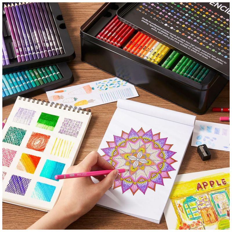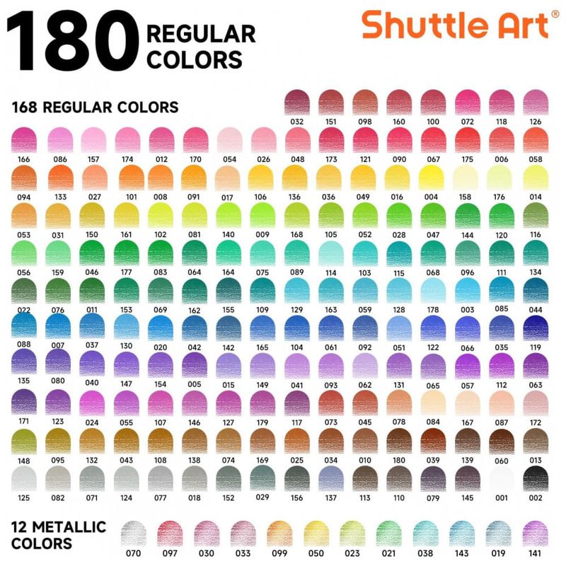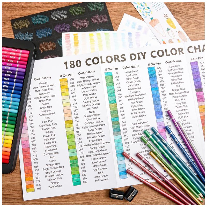 O conjunto de 180 lápis de cor Shuttle Art contém 180 cores vibrantes com núcleo macio e 4 apontadores em uma robusta caixa de metal, perfeita para crianças, adultos e artistas colorirem, esboçarem e desenharem. Cada lápis pré-afiado é rotulado com nome e número de cor, correspondendo perfeitamente ao gráfico de cores DIY. Feitos com minas fortes e resistentes e madeira premium, esses lápis são altamente duráveis e fáceis de afiar, oferecendo desempenho confiável. Com pigmentação rica e misturável, proporcionam excelente cobertura de cor e aplicação suave, permitindo misturar e sobrepor cores facilmente. Garanta horas de diversão artística com este conjunto de lápis de alta qualidade da Shuttle Art.