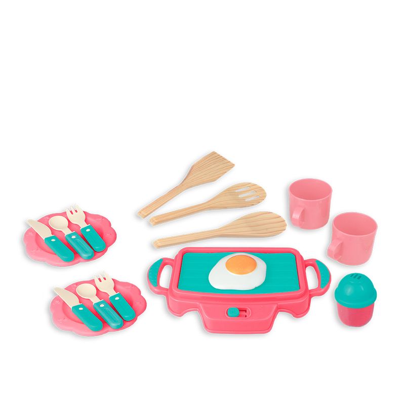 3 Talheres grandes que imitam madeira, 2 pratinhos, 2 facas, 2 colheres, 2 garfos, 2 canecas, 1 saleiro,1 ovo frito, 1 toalha de papel para que a brincadeira fique muito mais divertida.