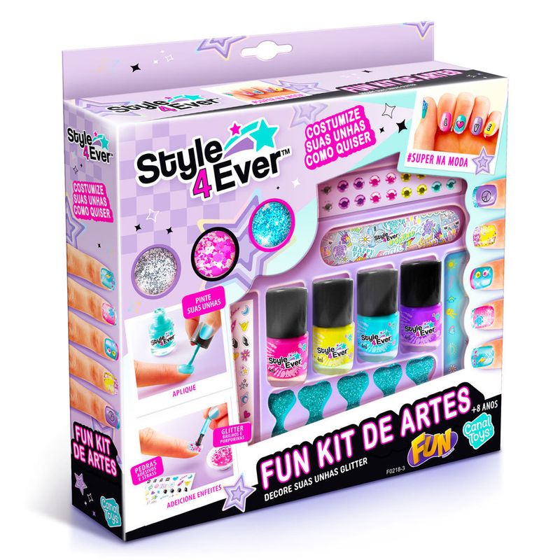 Kit com esmaltes e decorações para as unhas. Fun Kit Unhas De Glitter vem com 4 esmaltes com cores diferentes, 3 potes com glitter, 1 cartela com mais de 100 adesivos para unha, 1 cartela com strass, 1 cartela com adesivos 2D, 1 lixa de unha, 1 pincel, 1 separador de dedos e 1 manual de instruções.