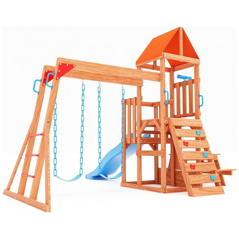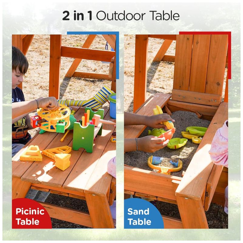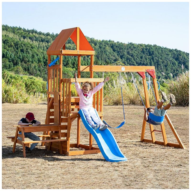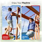 Estrutura fabricada em madeira de cedro de alta qualidade, conferindo resistência à água, corrosão e rachaduras, adequada para uso externo em diferentes condições climáticas. O conjunto inclui barra de macaco para desenvolvimento do equilíbrio, mesa externa 2 em 1 que funciona como mesa de piquenique ou mesa de areia, escorregador em estilo onda com 1,83 m, parede de escalada, forte com telescópio para brincadeiras criativas, e dois balanços de cinto com correntes projetadas para segurança, evitando lesões por dedos ou cabelos presos. A construção possui parafusos resistentes a rachaduras na madeira e suportes com duas ancoragens por poste para estabilidade reforçada. Medidas aproximadas de 322 cm (profundidade) x 386 cm (largura) x 276 cm (altura). Capacidade máxima de peso suportada de até 200 kg. Indicado para crianças dos 3 aos 10 anos. Requer montagem detalhada com manual e hardware separados conforme etapa.
