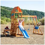 Componentes: Barra de macaco, mesa 2 em 1 (mesa e mesa de areia), escorregador tipo onda, parede de escalada, forte com telescópio, 2 balanços com cinto