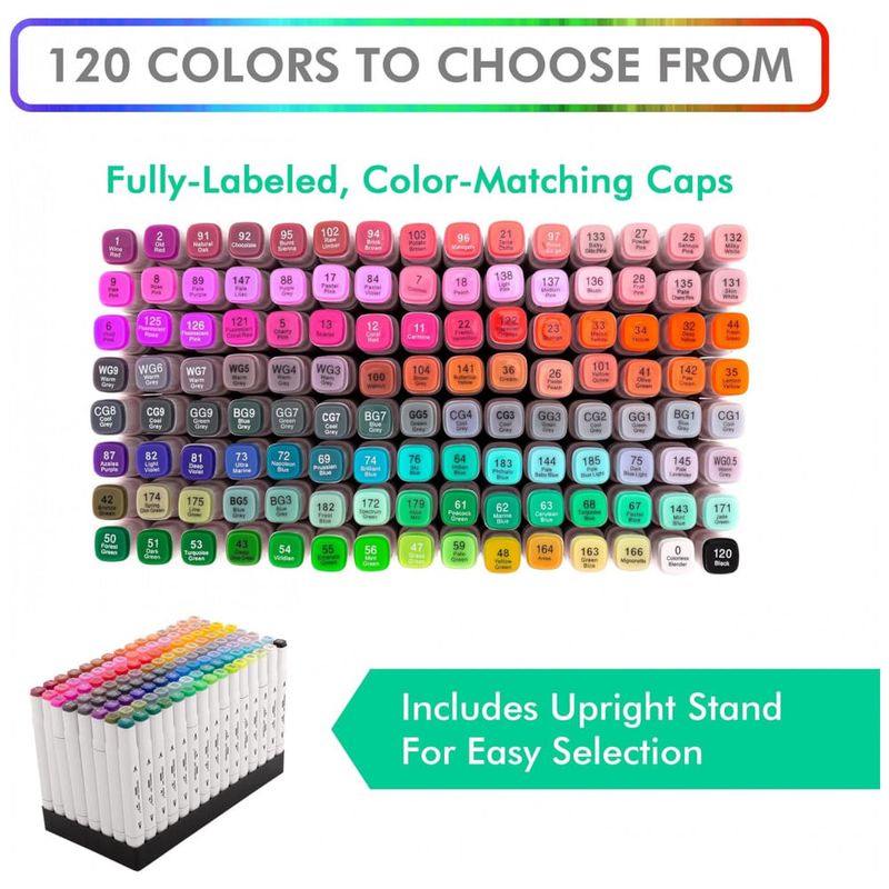COLORIR SUA IMAGINAÇÃO: O que quer que você sonhe, esses marcadores de dupla face ajudam a torná lo realidade. Cada conjunto vem com 120 cores, incluindo um marcador de mistura incolor. E para facilitar a identificação dos matizes, as tampas possuem códigos numéricos úteis.