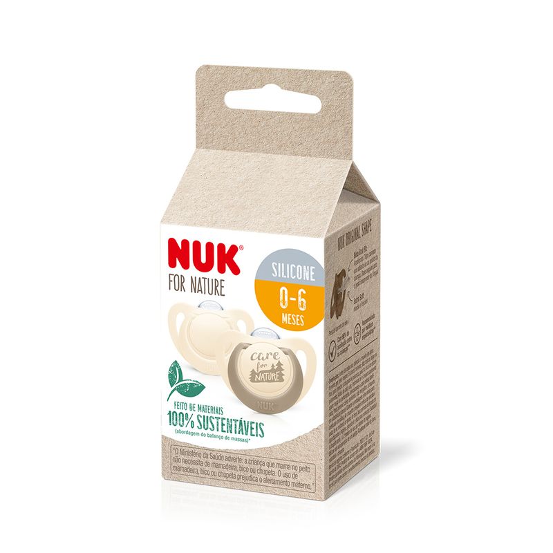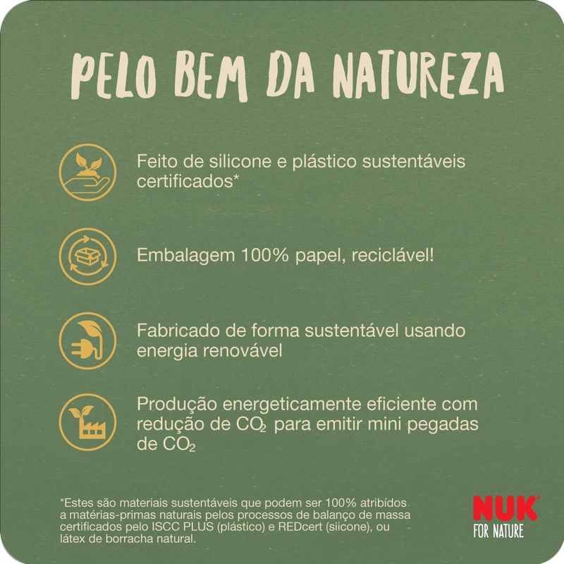 O kit com 2 Chupetas NUK For Nature Silicone é fabricado com materiais 100% sustentáveis com escudo côncavo para o posicionamento correto na face da criança e o recorte permite o encaixe na área nasal, bico NUK Oral Fit 2.0 no formato anatômico, com topo curvado que se adapta ao palato da criança e base angular para o correto posicionamento da língua. O silicone utilizado neste produto é certificado pelo REDcert², garantindo que ele foi produzido a partir de matérias-primas renováveis e sustentáveis. O REDcert² é uma certificação reconhecida internacionalmente e garante que o silicone seja livre de produtos químicos nocivos. Sua embalagem é feita de papel 100% reciclado, certificado pelo FSC (Conselho de Manejo Florestal). A Certificação Florestal do FSC ajuda na preservação dos recursos naturais, garantindo que os produtos com origem em uma determinada floresta foram obtidos com respeito ao meio-ambiente. A chupeta é livre de BPA Free.