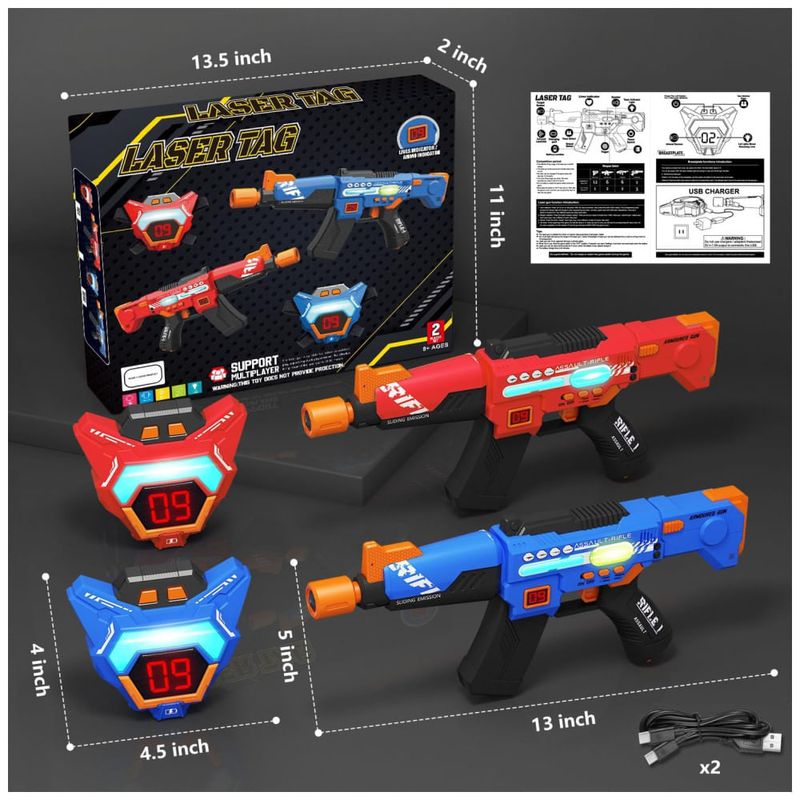 Novo Conjunto de Laser Tag Recarregável: Estamos comprometidos em oferecer uma experiência de jogo interativa aprimorada e mais confortável para as crianças. Agora, com este conjunto de 2 submetralhadoras de laser tag atualizadas, sua família e seus filhos terão a melhor experiência de laser tag. O pacote inclui 2 pistolas de laser e 2 coletes multifuncionais com LED digital, além de um cabo de carregamento USB 2 em 1, eliminando a necessidade de trocas constantes de pilhas. Após 1 a 1,5 horas de carregamento, você poderá aproveitar de 8 a 9 horas de diversão contínua.