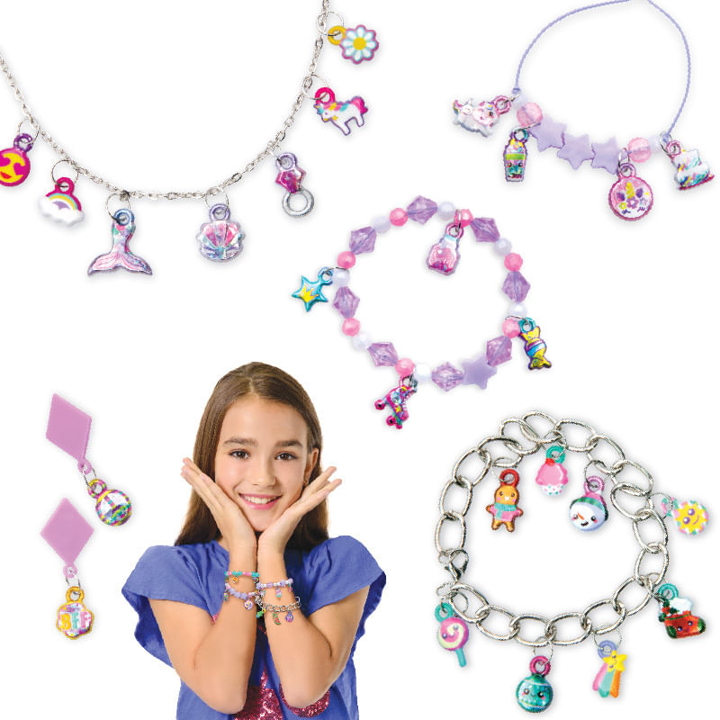 Um kit encantador repleto de miçangas coloridas e pingentes fofos para montar pulseiras únicas. Perfeito para pequenos artistas criarem, combinarem e brilharem com muito estilo!